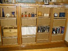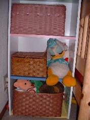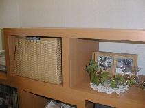 となりの写真と同じ棚。(手作りした棚 です。)雑誌入れのバス ケットを入れ ています。 |