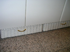 | 下駄箱下の隙間に収納を。。。 ハードクラフトで丈夫に編みました。 底面裏には「どこでもキャスター つけて、スムーズに引き出せます。 金具の持ち手をつけて。 |