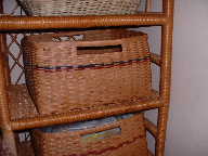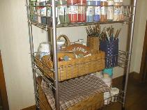 | トールペイントの道具を入れているラッ クです。ごちゃごちゃした道具類もバス ケットで整理します。 丸く編んで、筆入れも作りました。 |