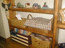 カウンター下のスペースにこんなお揃 いのバスケットで整理整頓。星条旗 柄の布で、リボンと上部をぐるりと包み 込みました。 |